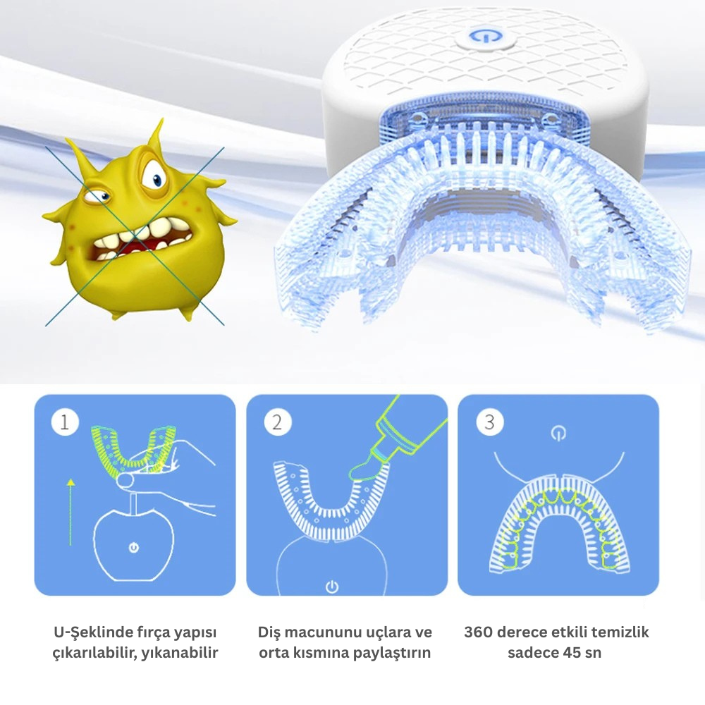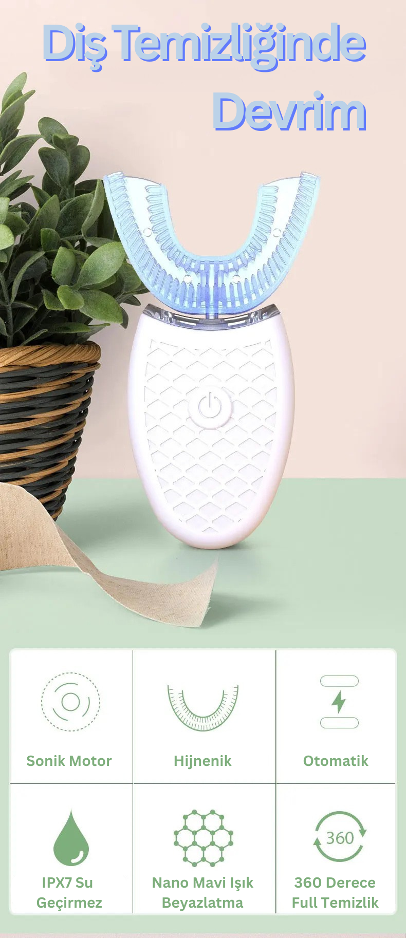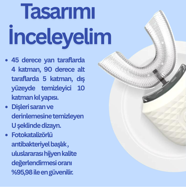 - Benzersiz U-şekilli Ağza Uygun Tasarımı: U-şekli ağız şekline uyacak şekilde tasarlanmıştır, dişlerin yüzeyini ve içini her yöne temizleyebilir.
